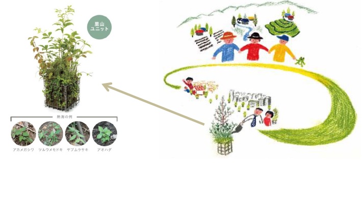都市緑化ニーズの高い東京の自然植生に近い、静岡県熱海市をはじめとする「本州中部太平洋側地域※」の里山から供給される在来種を、寄せ植えした“里山ユニット”を使って市街地を緑化します。まずは熱海の放置里山で在来種苗の供給ノウハウを構築、その後は、この取り組みを全国の荒廃里山へと広げ、将来的には、「関東の里山」「九州の里山」など、各市街地の緑化に対応できるネットワークづくりをめざしています。