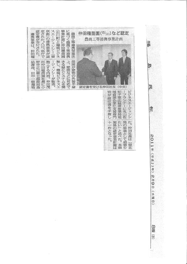 【地方紙】福島民報 仲田種苗園(石川)など認定 農商工連携事業計画