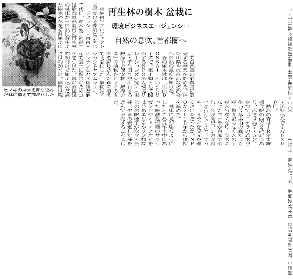 【一般紙】日経新聞 再生林の樹木 盆栽に 自然の息吹、首都圏へ