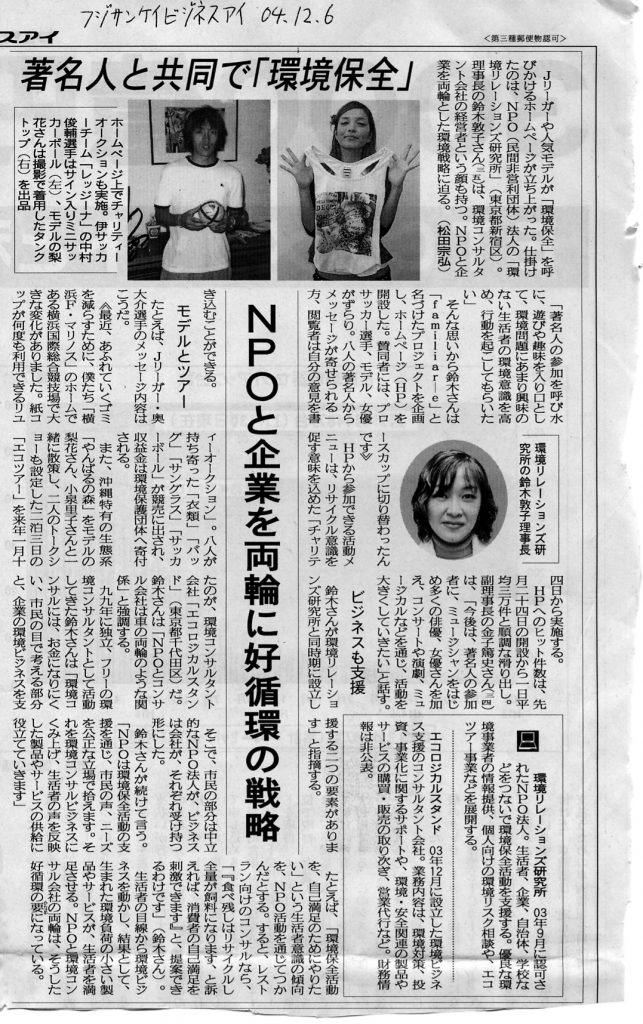 【一般紙】フジサンケイビジネスアイ NPOと企業を両軸に好循環の戦略 著名人と共同で「環境保全」