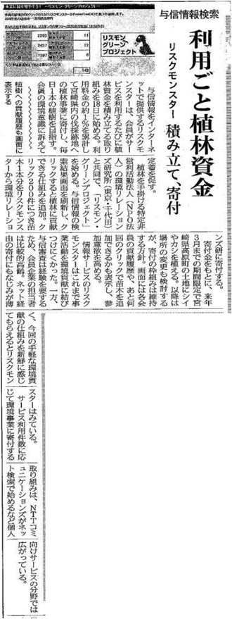 【一般紙】日経産業新聞 利用ごと植林資金 リスクモンスター 積み立て、寄付