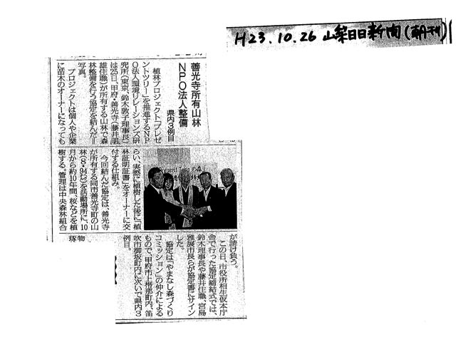 【地方紙】山梨日日新聞 善光寺所有山林 NPO法人整備 県内3例目