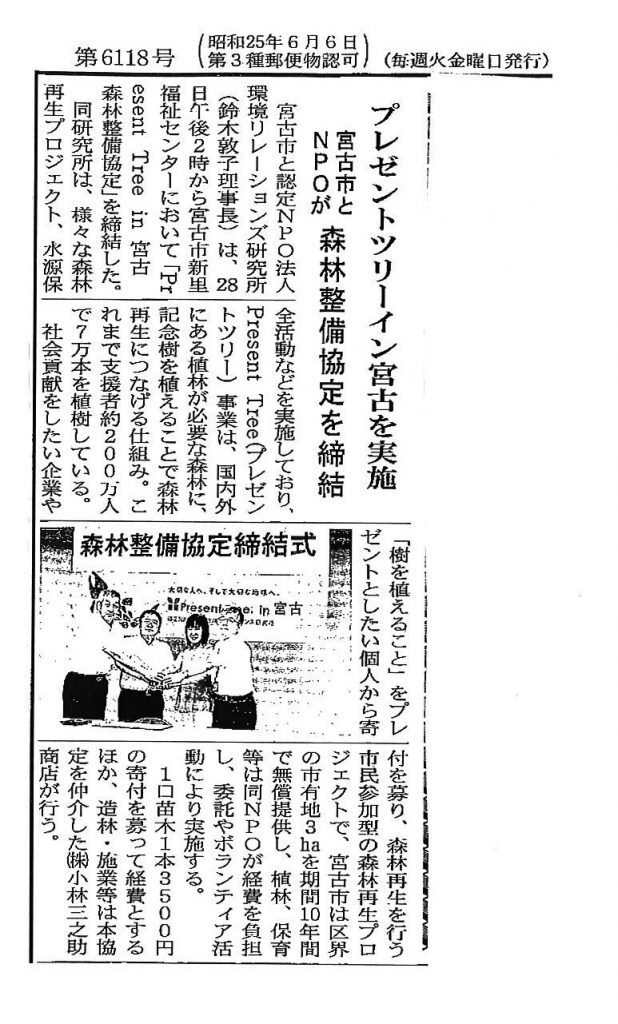 【業界紙】岩手県林業新報 プレゼントツリーイン宮古を実施 宮古市とNPOが森林整備協定を締結