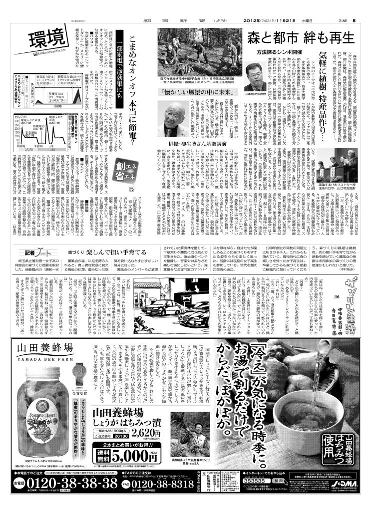 【全国紙】朝日新聞 森と都市 絆も再生 気軽に植樹・特産品作り