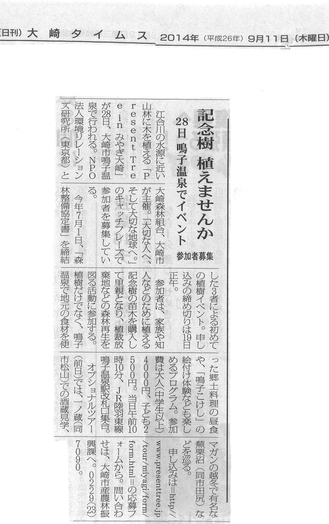 【地方紙】大崎タイムス 記念樹植えませんか 28日 鳴子温泉でイベント 参加者募集