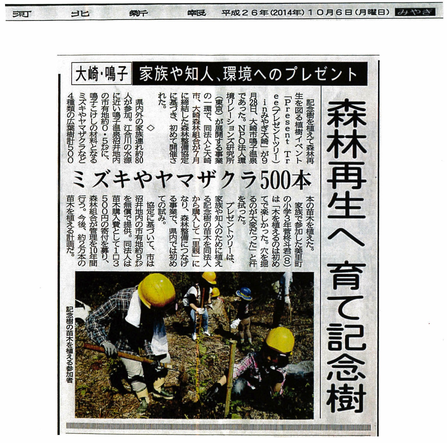 【地方紙】河北新報 大崎・鳴子 家族や知人、環境へのプレゼント 森林再生へ 育て記念樹 ミズキやヤマザクラ500本
