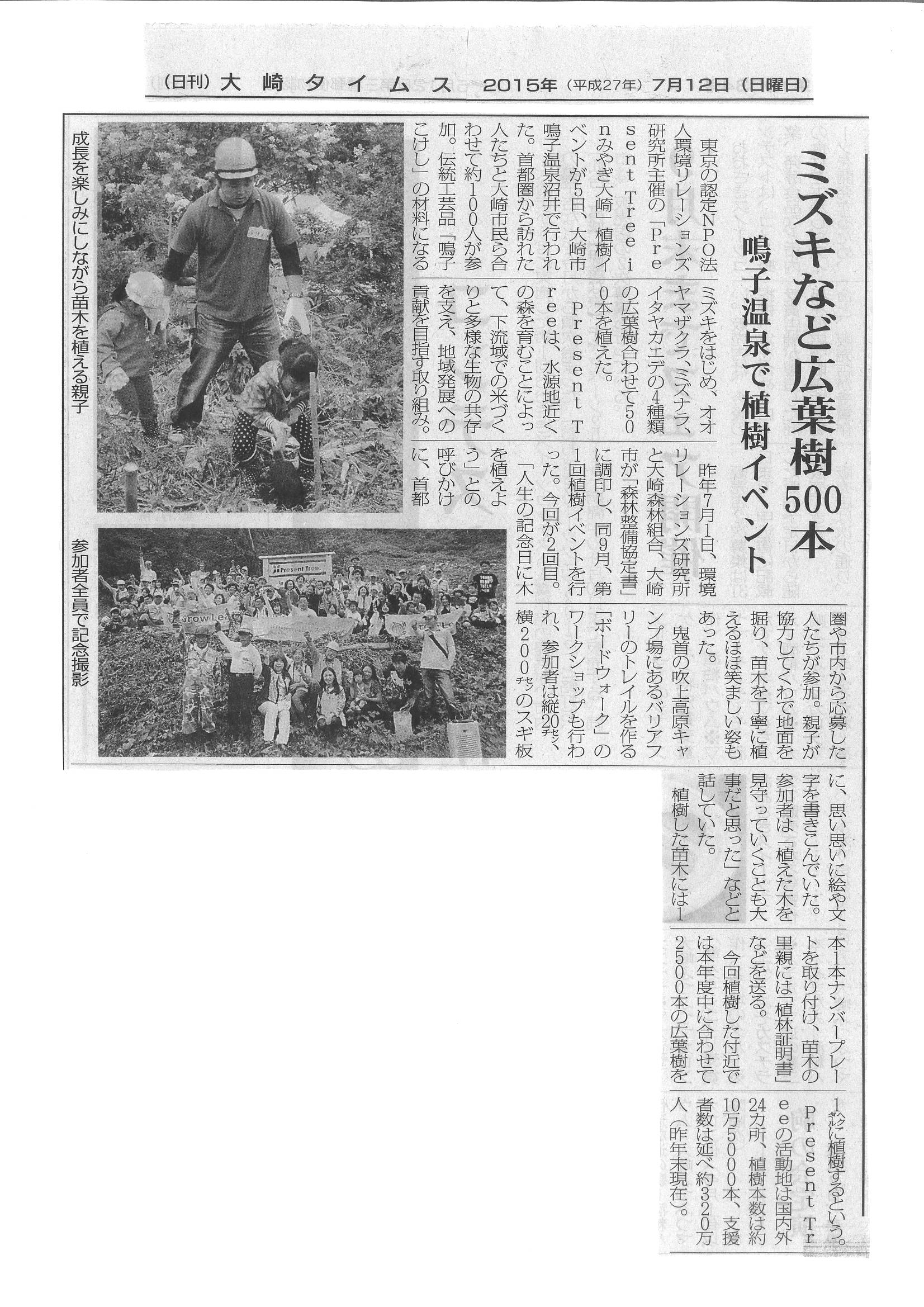 【地方紙】大崎タイムス ミズキなど広葉樹500本 鳴子温泉で植樹イベント