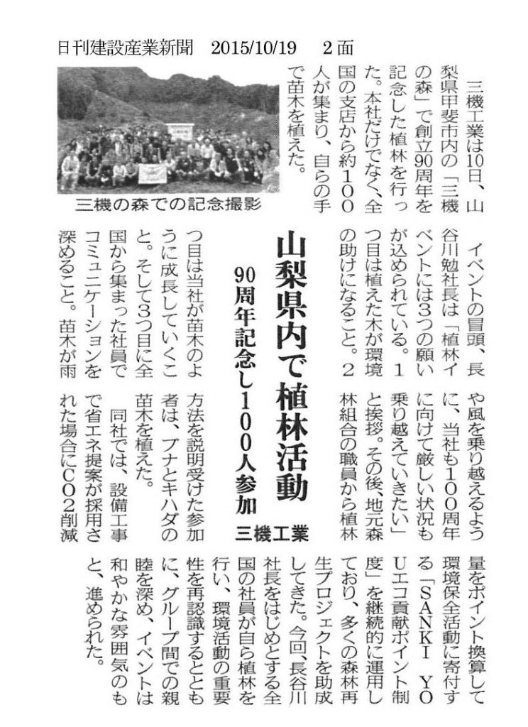 【業界紙】建設通信新聞 木のごとく生長願う 90周年で植林行事 三機工業が森構築