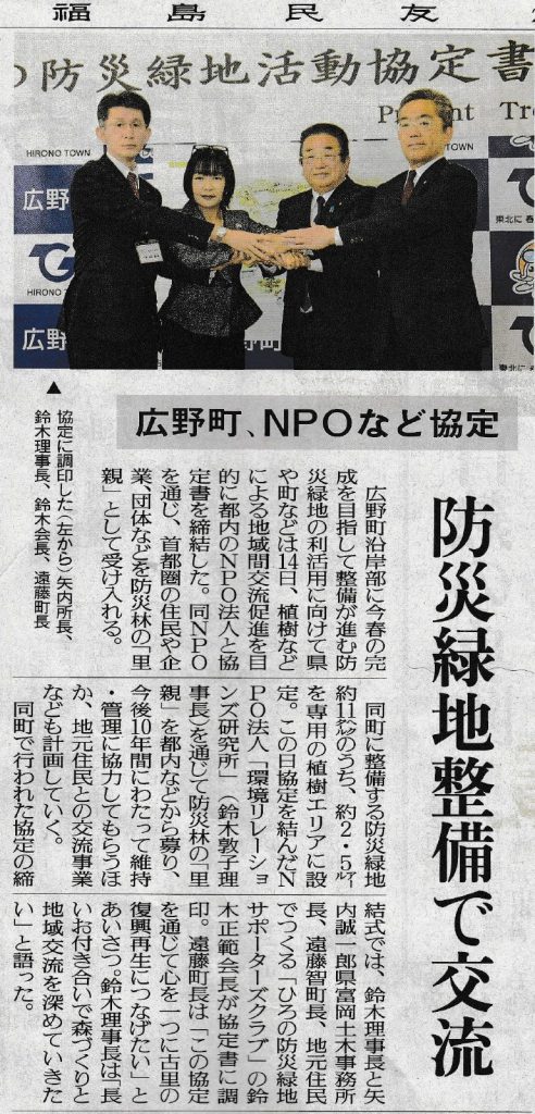 【地方紙】 福島民友 防災緑地整備で交流 広野町、NPOなど協定