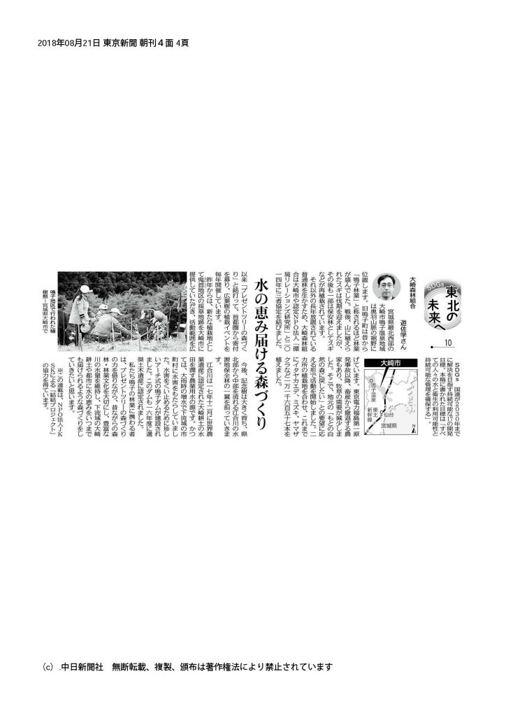【地方紙】 東京新聞に「PTみやぎ大崎」パートナーである大崎森林組合の寄稿記事が掲載されました