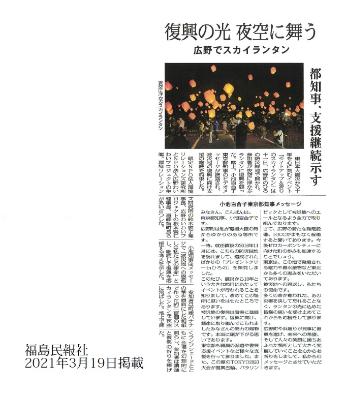 PresentTree in ひろのイベント 『3.11復興 10周年を心に刻むライトアップ&祈りのスカイランタン 』が、3月12日と19日に福島民報に掲載されましたのでご報告いたします。