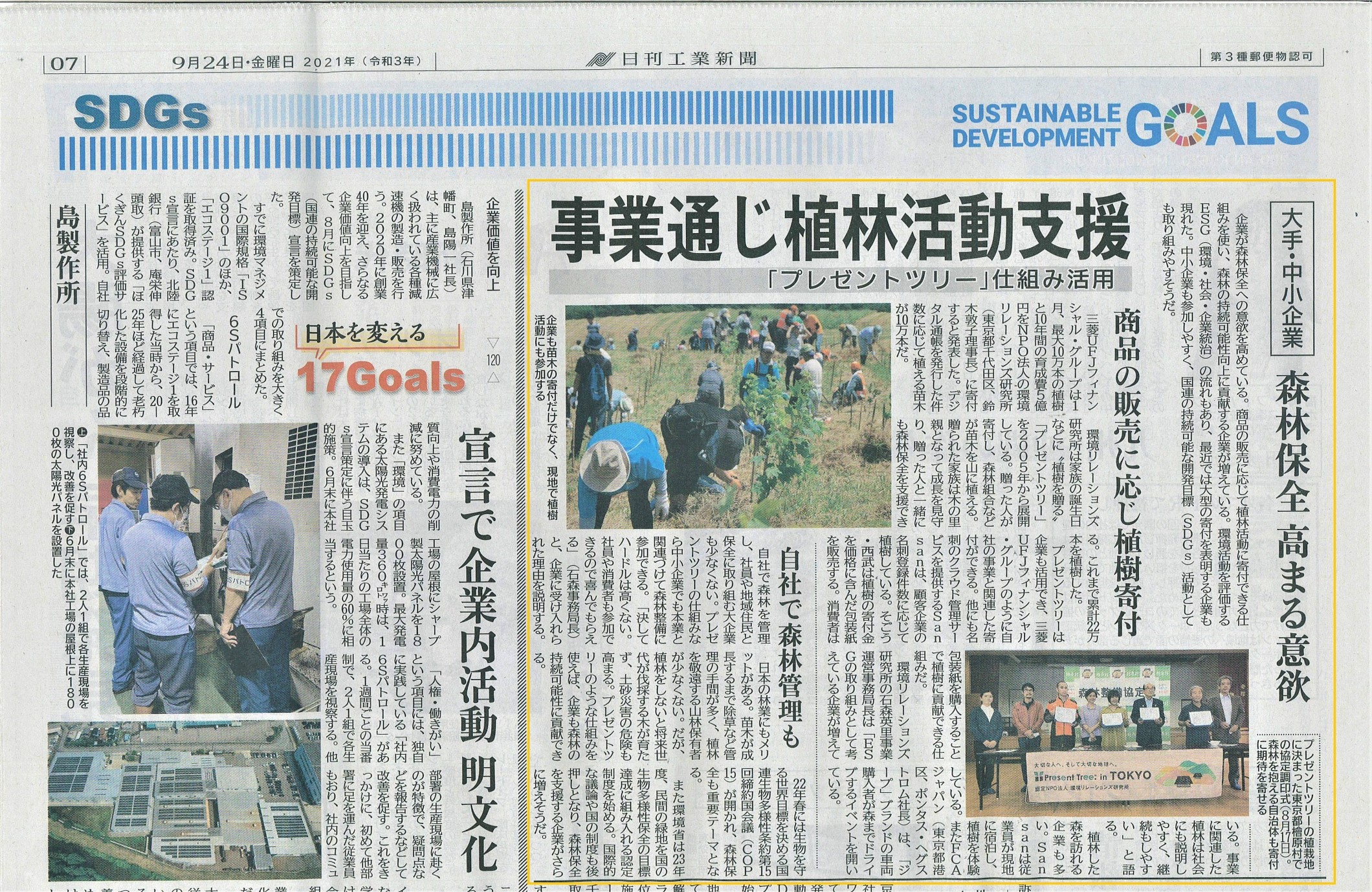 2021年9月24日発行の日刊工業新聞のNewsウエーブ21にてプレゼントツリーの仕組みを活用した企業の植樹活動についての記事が掲載されています。