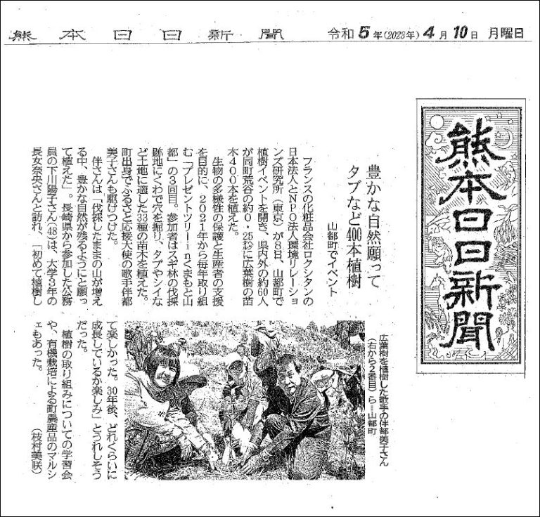 2023年4月8日に山都町(熊本県上益城郡)で開催されたロクシタンさまとの「プレゼントツリー inくまもと山都」についての記事が2023年4月10日の熊本日日新聞に掲載されましたので、ご報告いたします。