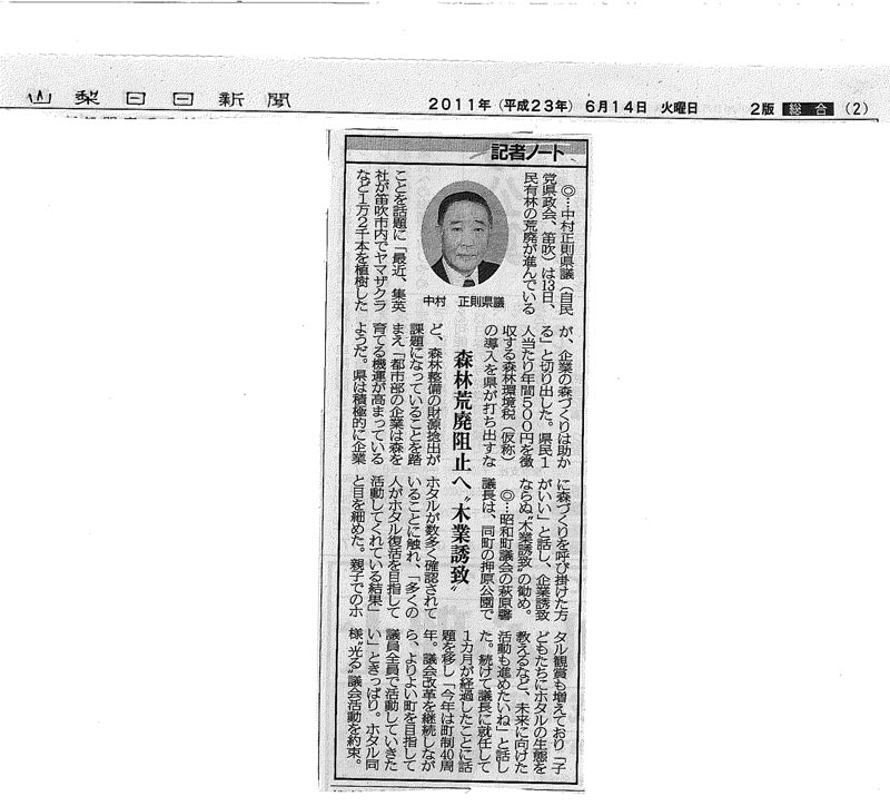 【地方紙】山梨日日新聞 森林荒廃阻止へ”木業誘致”