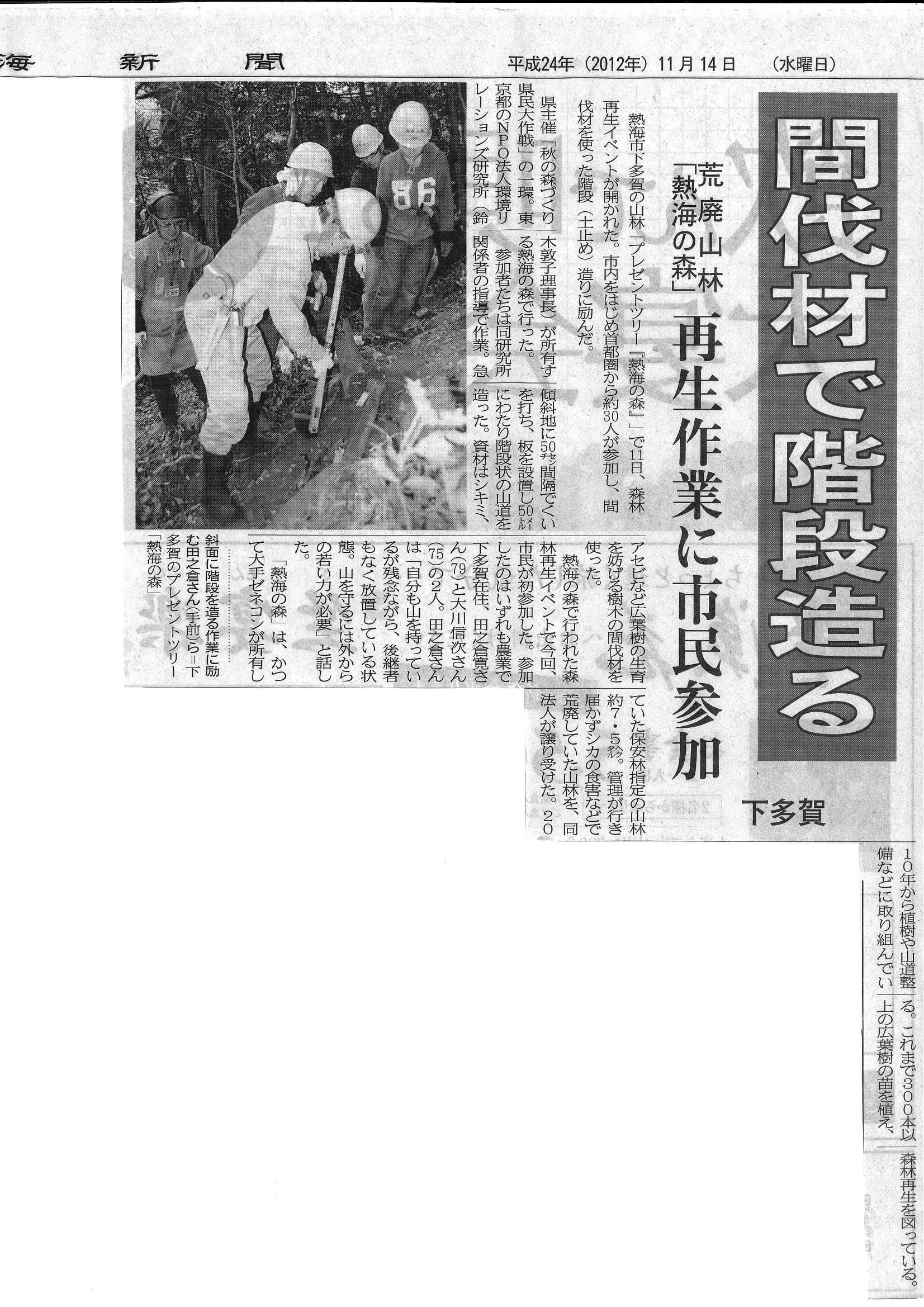 【地方紙】熱海新聞 間伐材で階段造る 荒廃山林「熱海の森」再生作業に市民参加