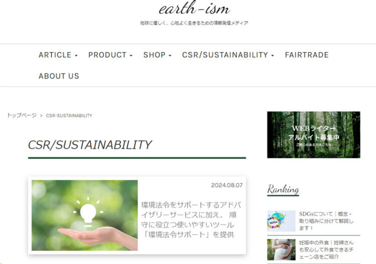 「earth-ism」というwebメディアをご存じでしょうか? 明日のために、”人”と”地球”に優しい情報やニュースをお届けする総合情報発信サイトとして、ウェルネスやサステナブルといったコンテンツを提供しており、環境や未来に関心のある方々に人気のサイトです。このたび、そんな「earth-ism」さんにて、弊社の環境法令サポートをご紹介いただきました!