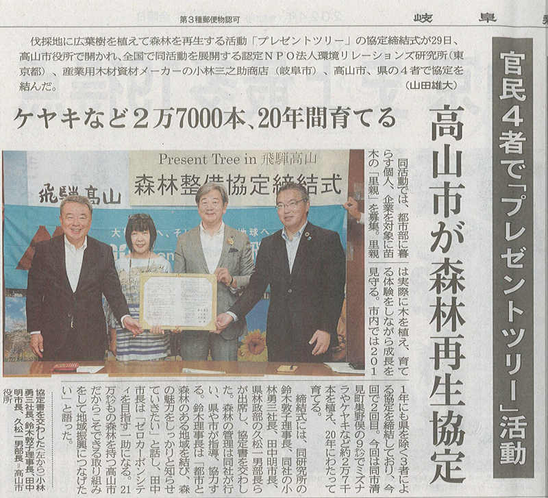 8月29日に行われた「Present Tree in 飛騨高山」森林整備協定締結式の様子が、8月30日の岐阜新聞朝刊に掲載されました。ご取材いただき、誠にありがとうございます! 高山市の森づくりを地元の皆様・里親の皆さまと共に進めてまいりますので、これからも温かいご支援をどうぞよろしくお願いいたします。